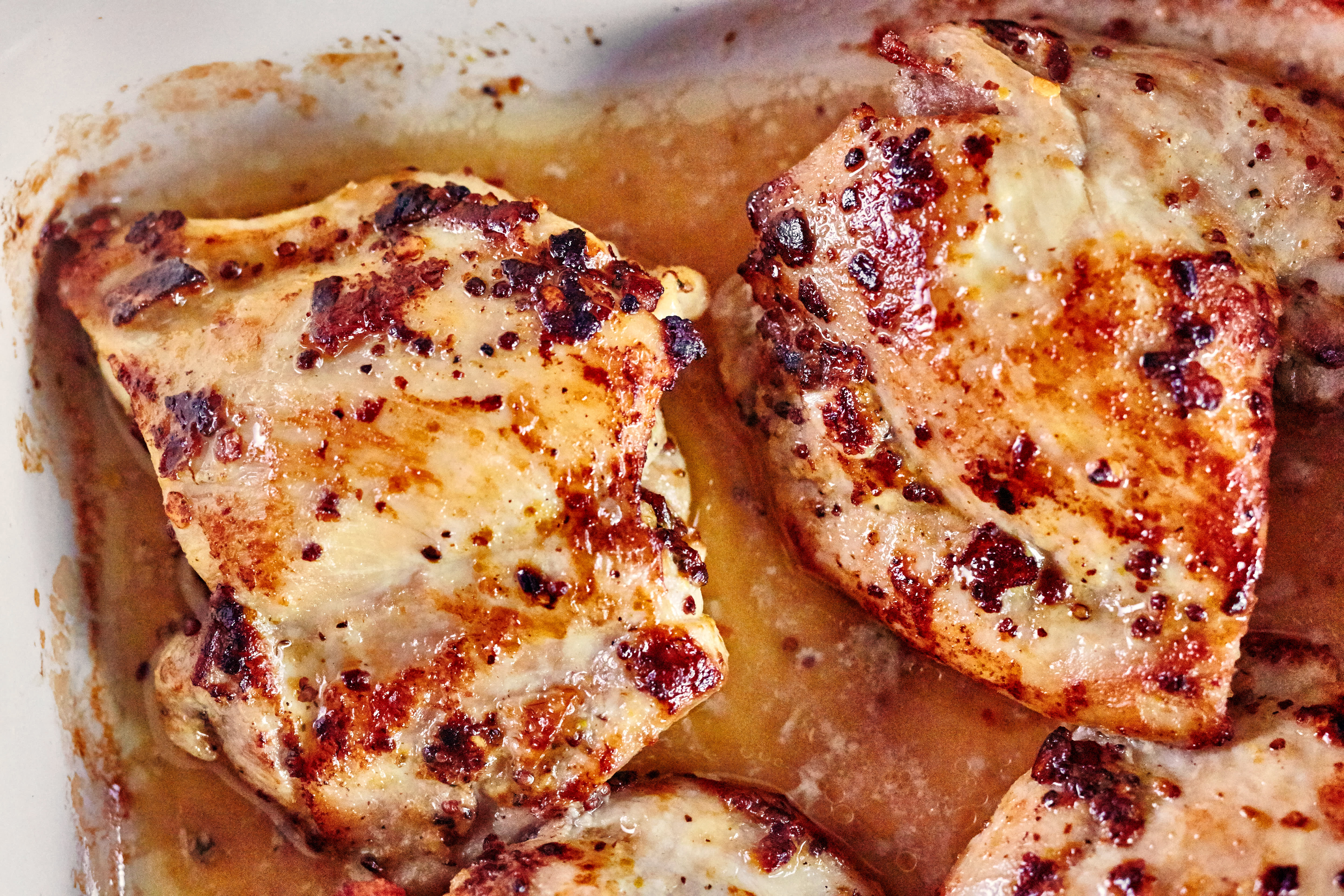 Crispy Baked Chicken Thighs Recipe | The Modern Proper from images.themodernproper.com Dip the chicken in the mustard mixture to coat and roll in the panko on all sides. Chicken thighs are one of the most beloved ingredients for inexpensive and flavorful weeknight meals. Carefully set the chicken on an oven tray, then generously apply the honey garlic sauce all over the chicken. Mar 02, 2021 · apply sauce & broil in oven or air fryer: Sprinkle the chicken thighs with 1/2 teaspoon salt. Different cuts require different cooking times. Place an oven rack in the middle position. Then, position the chicken thighs in the skillet with the skin facing down if you are leaving the skin on them.